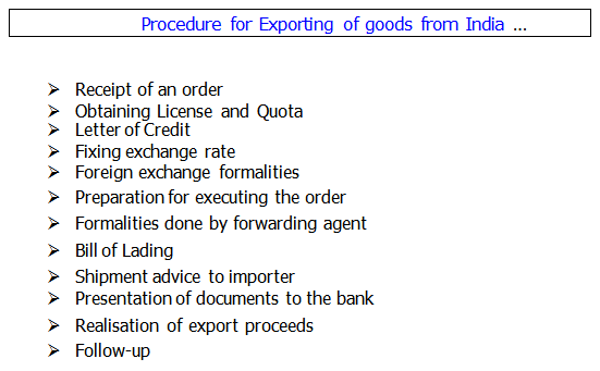 The exporter has to get himself registered with various authorities like RBI, income tax authorities, etc. In addition, he has to appoint agents or distributors for collection of orders from foreign countries. Exporter receives an order from importer directly or through Indent House.
